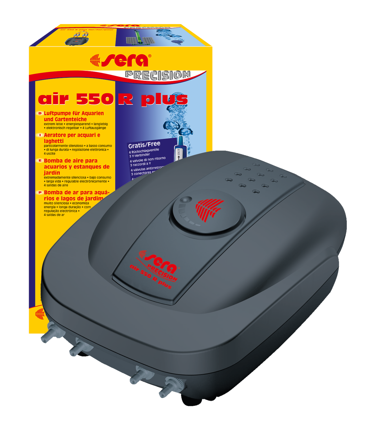 Bomba de aire SERA air plus 550 R, potente (550l/h) y silenciosa, con cuatro salidas. Con sistema antivibración, incluye valvula antirretorno y pieza para unificar las salidas. Regulable.