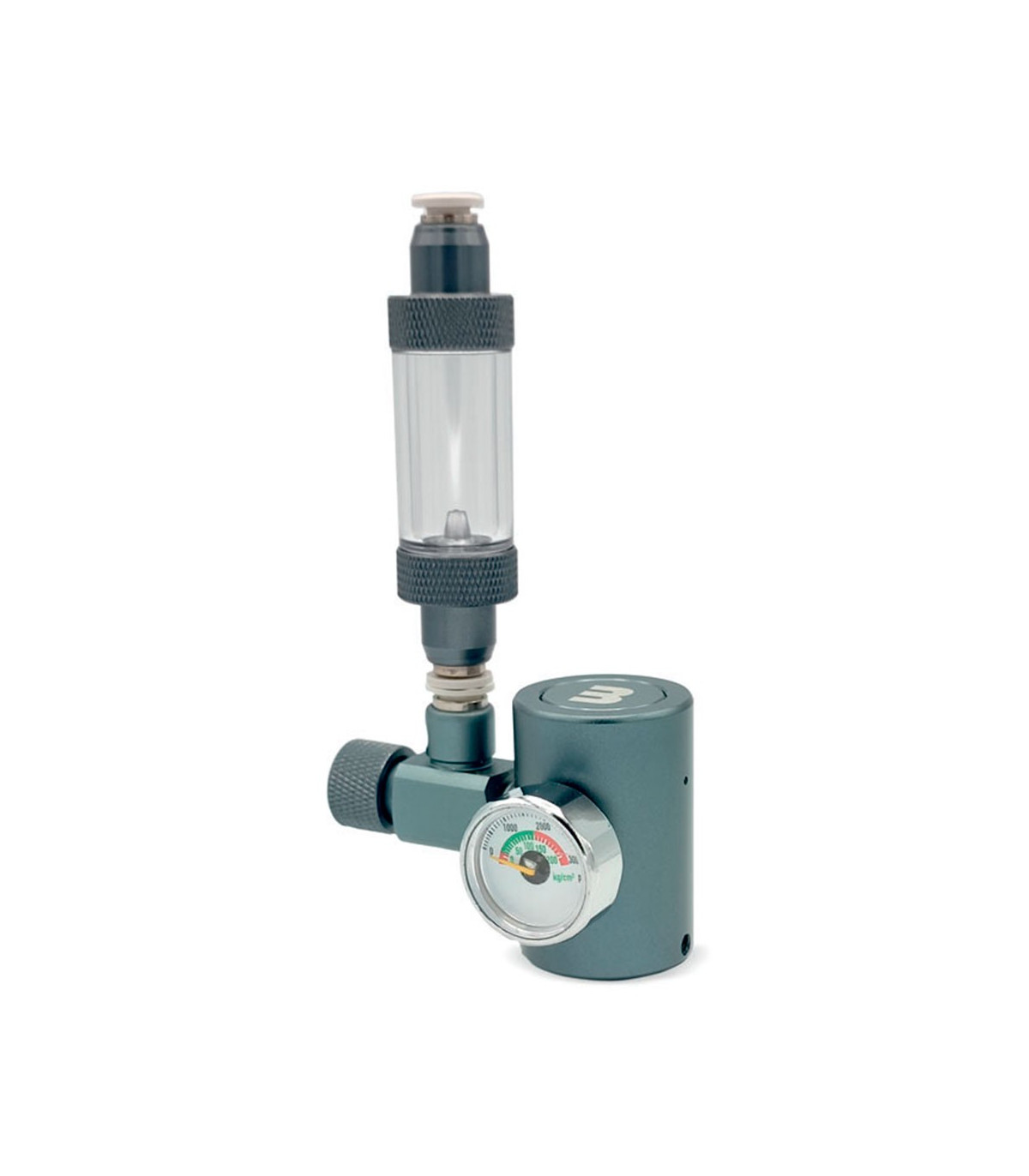 Reductor de presión compacto con 1 manómetro (carga de cilindro) para sistemas de CO2. Incluye gotero para visualizar la cantidad de Co2 dosificada en el acuario. Para cilindros recargables.
